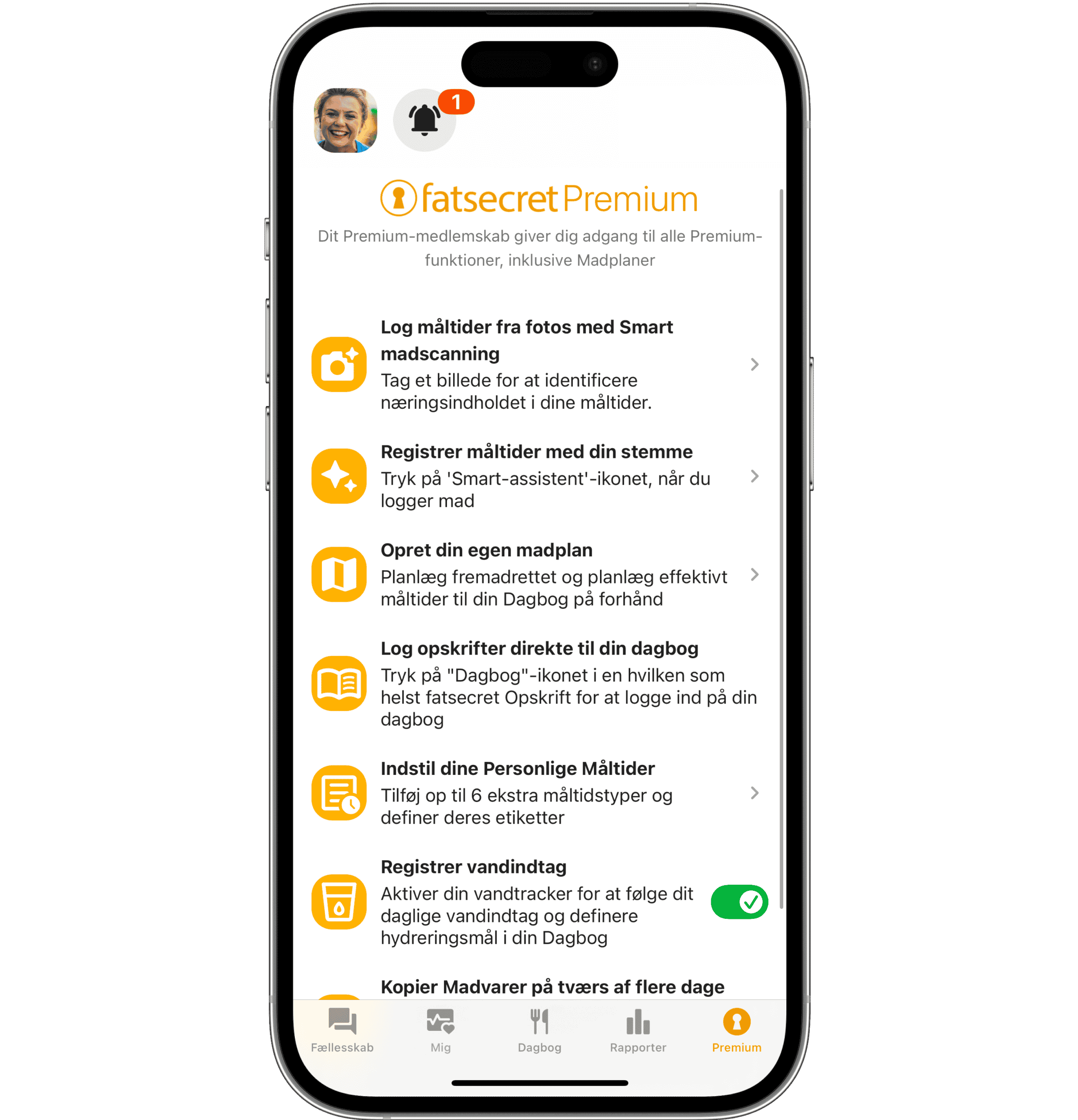 fatsecret-appen og dens kernefunktioner er helt gratis at bruge. Det inkluderer kalorie- og makrosporing understøttet af verdens største fødevare- og ernæringsdatabase, vægtregistrering, stregkodescanner og adgang til vores fællesskab. Hvis du ønsker flere værktøjer og mere støtte, er fatsecret Premium tilgængelig som en betalt opgradering i appen. Den indeholder ekstra funktioner som måltidsplaner designet af diætister, avancerede sporingsværktøjer, vandtracker, læringscenter og meget mere. Prisen og tilgængeligheden af Premium kan variere afhængigt af region og kan ses direkte i appen.