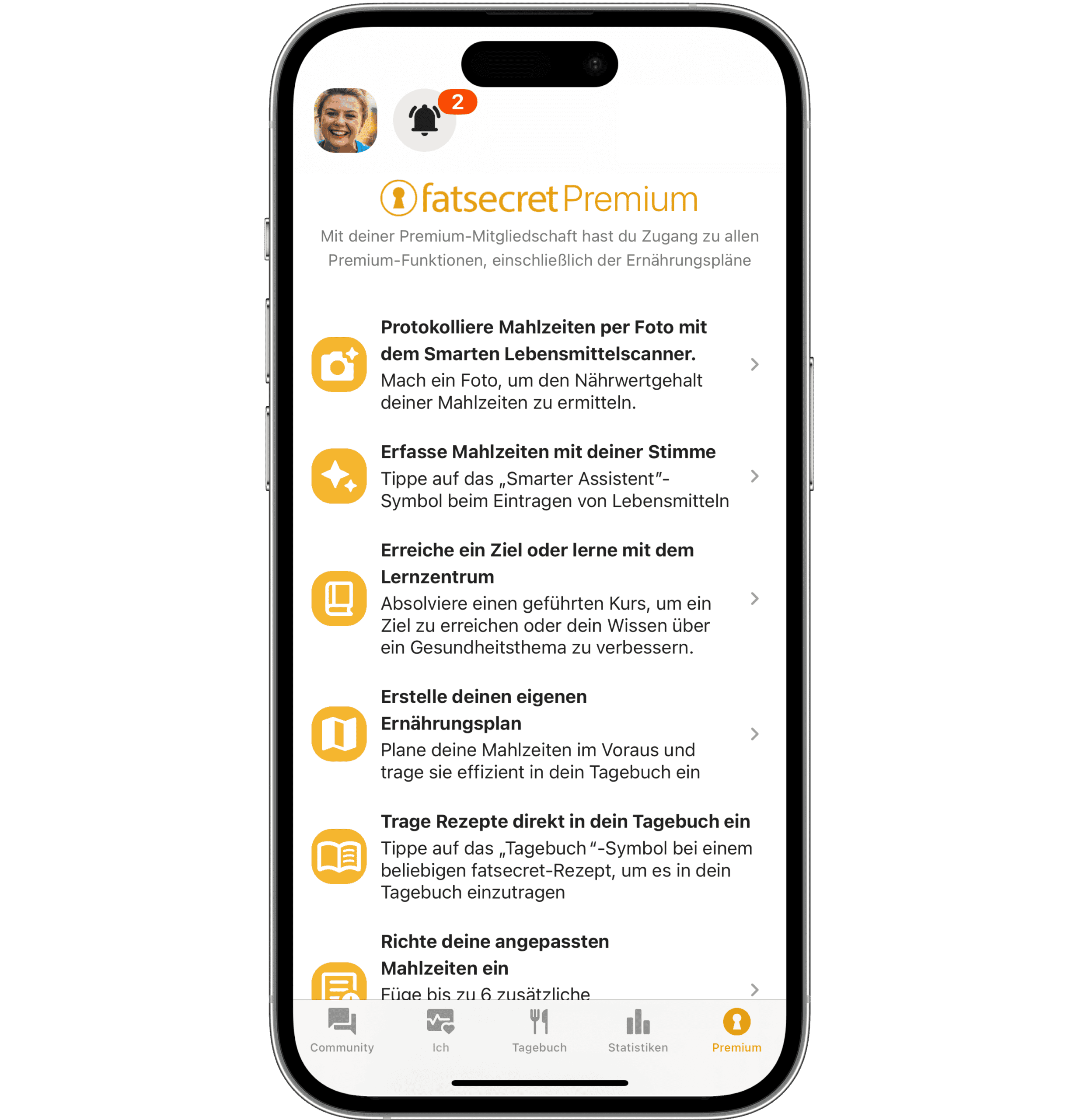 fatsecret Premium nimmt das Rätselraten beim Abnehmen ab und bietet Tools, die es einfacher und besser handhabbar machen. Wir verstehen deine Herausforderungen – deshalb sind unsere Premium-Funktionen so gestaltet, dass sie das Tracking vereinfachen, dir beim Dranbleiben helfen und dir die nötige Unterstützung bieten.