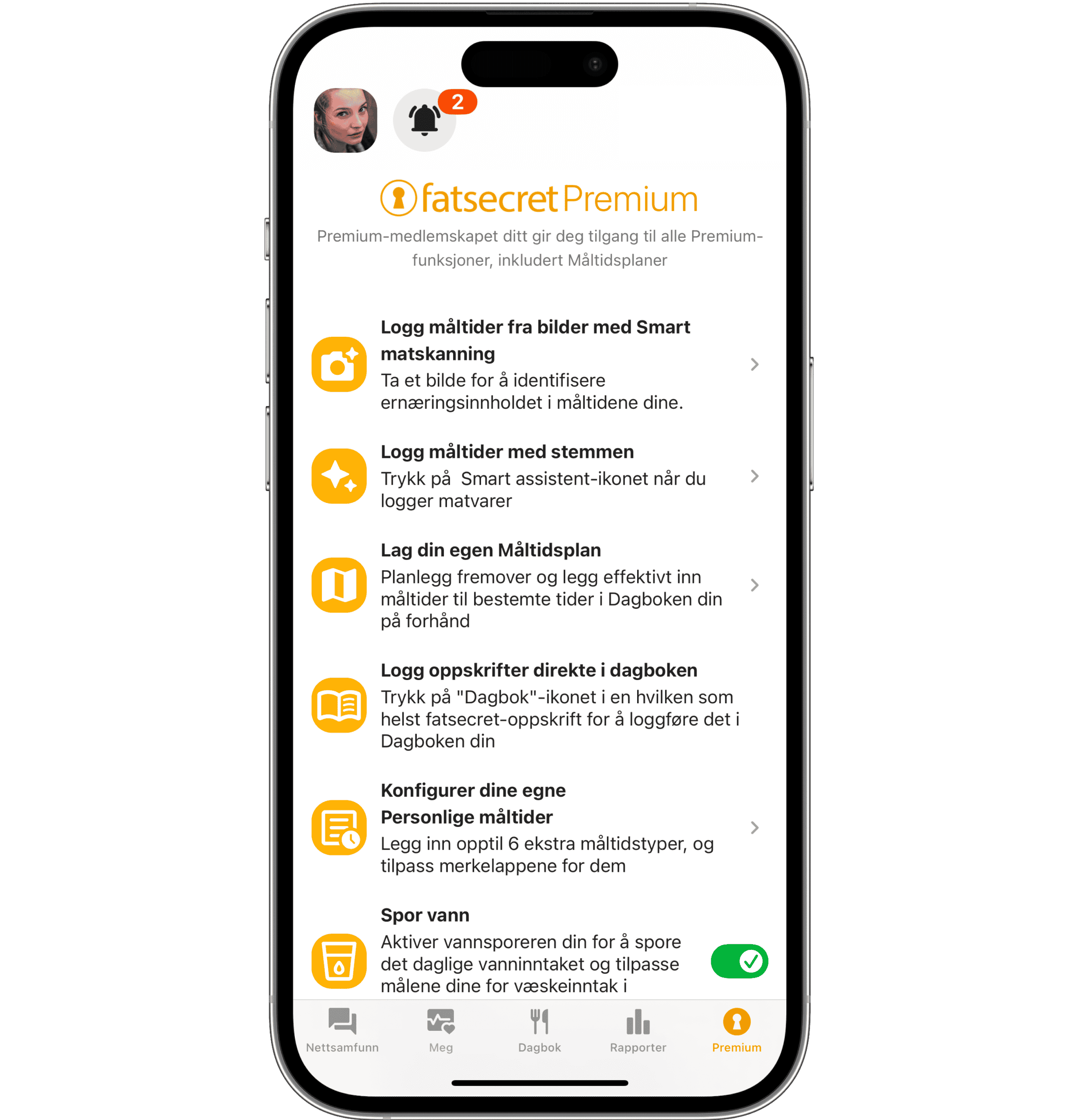 fatsecret-appen og dens kjernefunksjoner er helt gratis å bruke. Dette inkluderer sporing av kalorier og makronæringsstoffer støttet av verdens største mat- og ernæringsdatabase, vektregistrering, strekkodeskanner og tilgang til fellesskapet vårt. Hvis du ønsker flere verktøy og støtte, er fatsecret Premium tilgjengelig som en betalt oppgradering i appen og inkluderer ekstra funksjoner som måltidsplaner laget av ernæringsfysiologer, avanserte sporingsverktøy, vannsporing, læringssenter og mer. Pris og tilgjengelighet kan variere fra region til region og kan sees direkte i appen.