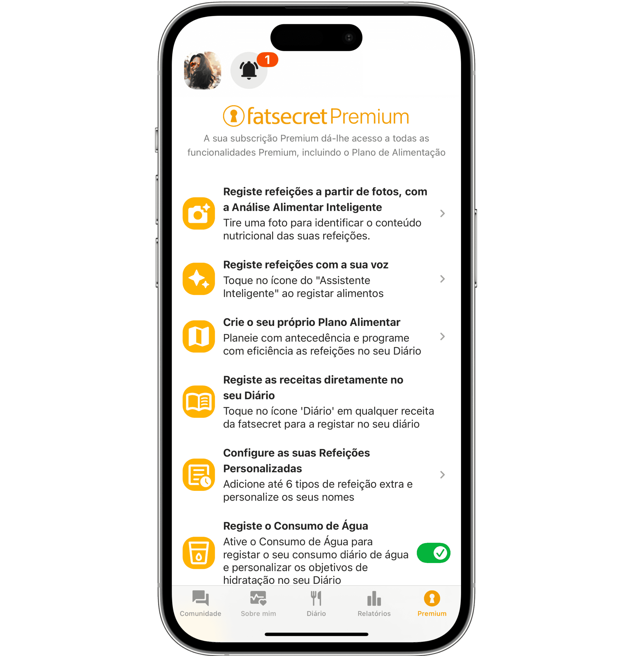 A app fatsecret e as suas funcionalidades principais são totalmente gratuitas. Isto inclui o registo de calorias e macronutrientes com base na maior base de dados alimentar e nutricional do mundo, registo de peso, leitor de códigos de barras e acesso à nossa comunidade. Se procuras mais ferramentas e apoio, o fatsecret Premium está disponível como upgrade pago na app e inclui funcionalidades adicionais como planos de refeições criados por nutricionistas, ferramentas de monitorização avançadas, controlo de ingestão de água, Centro de Aprendizagem e muito mais. O preço e a disponibilidade do Premium podem variar por região e podem ser verificados diretamente na app.