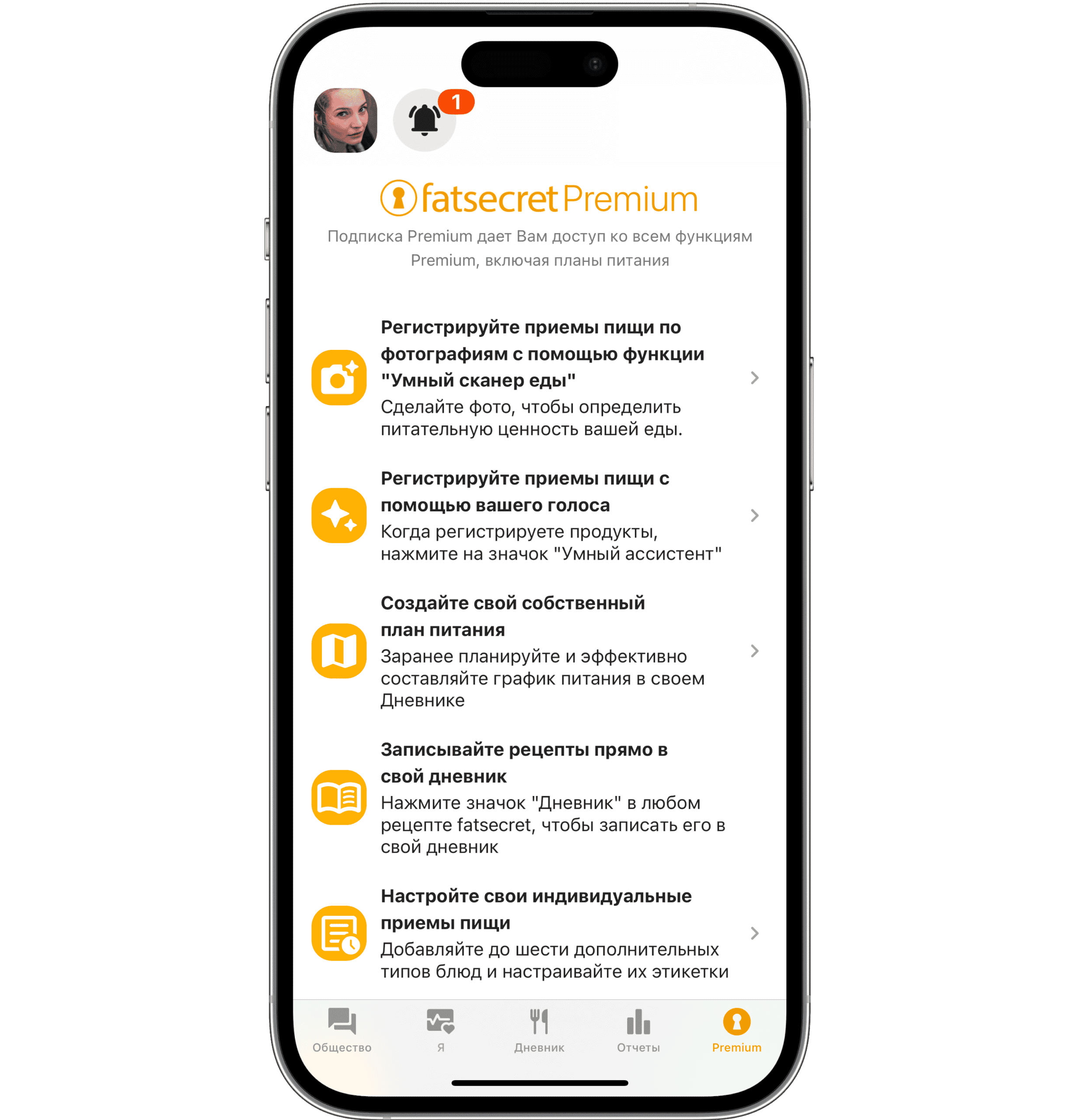 Приложение fatsecret и его основные функции полностью бесплатны. Это включает подсчет калорий и макроэлементов на основе крупнейшей в мире базы данных по питанию, отслеживание веса, сканер штрих-кодов и доступ к нашему сообществу. Если вы ищете дополнительные инструменты и поддержку, fatsecret Premium доступен как платное обновление в приложении и включает такие функции, как планы питания от диетологов, расширенные инструменты отслеживания, трекер воды, обучающий центр и многое другое. Стоимость и доступность зависят от региона и отображаются непосредственно в приложении.